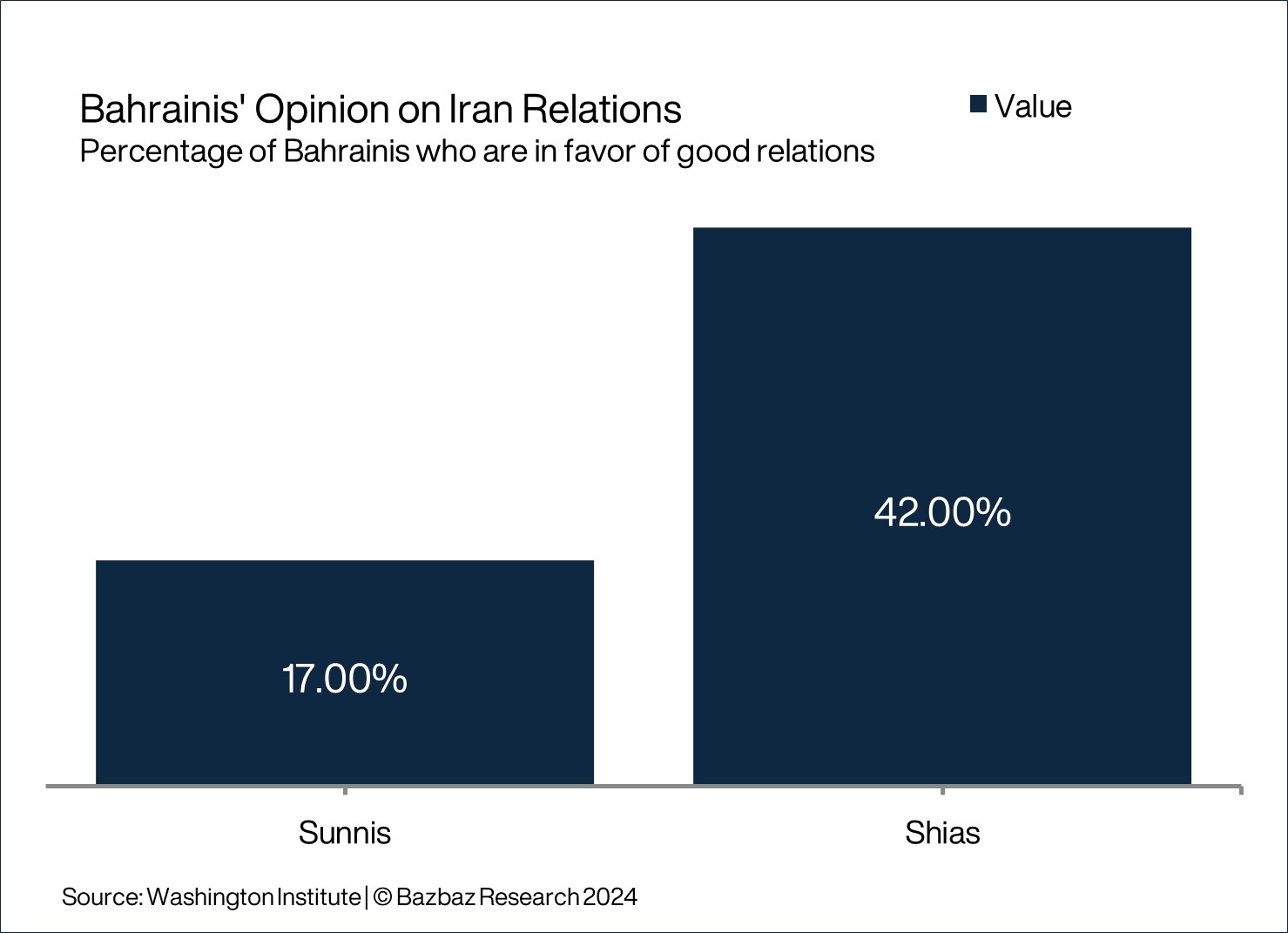 Bahrain faces a significant religious divide between its Sunni-majority government and Shia-majority population. Historically, Iran has supported Bahrain’s Shia community, leading to concerns among Sunni Bahrainis about Iran’s influence. Normalizing relations with Iran could exacerbate these religious tensions, potentially fueling domestic opposition and political unrest. Addressing these concerns and ensuring inclusive dialogue is essential to maintaining social cohesion within the country. A poll in 2022 showed that Bahrainis’ approval of good relations with Iran is low (Chart 1). However, this may have risen given recent developments.