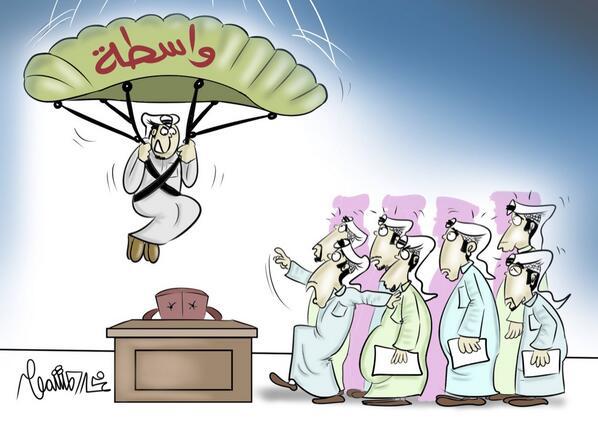 This cartoon shows a line of qualified prospects looking for work, when a man whose parachute says “wasta” suddenly parachutes onto an office desk, claiming the job. [Cartoon: Mohammed Almashmoum / X]